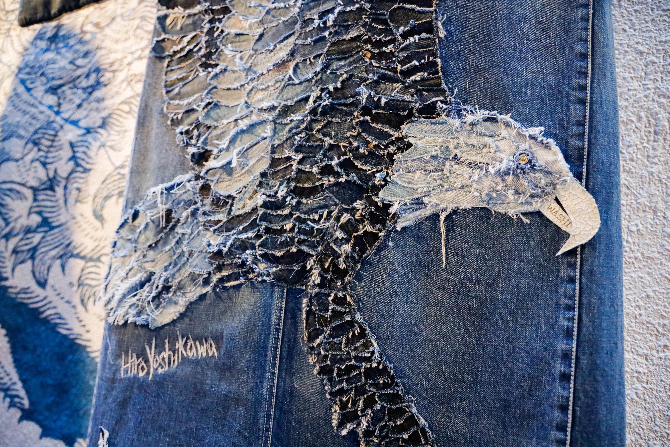 Hiroyuki來香港是為了尋找自己。但在他尋找自己的過程中,他的背景和家族傳統,一直是他最強的後盾。他的牛仔布藝非同凡響,以和紙揑成線所織出來的丹寧,穿起來冬暖夏涼而且不會皺,它本身就已經是一個紡織壯舉。加上有「洗水之王」稱號的Hiroyuki,在日本用當地天然水,洗出每條都性格不同的牛仔褲。而他用這些和紙丹寧所創作的藝術作品,亦掛滿工作室的牆上。