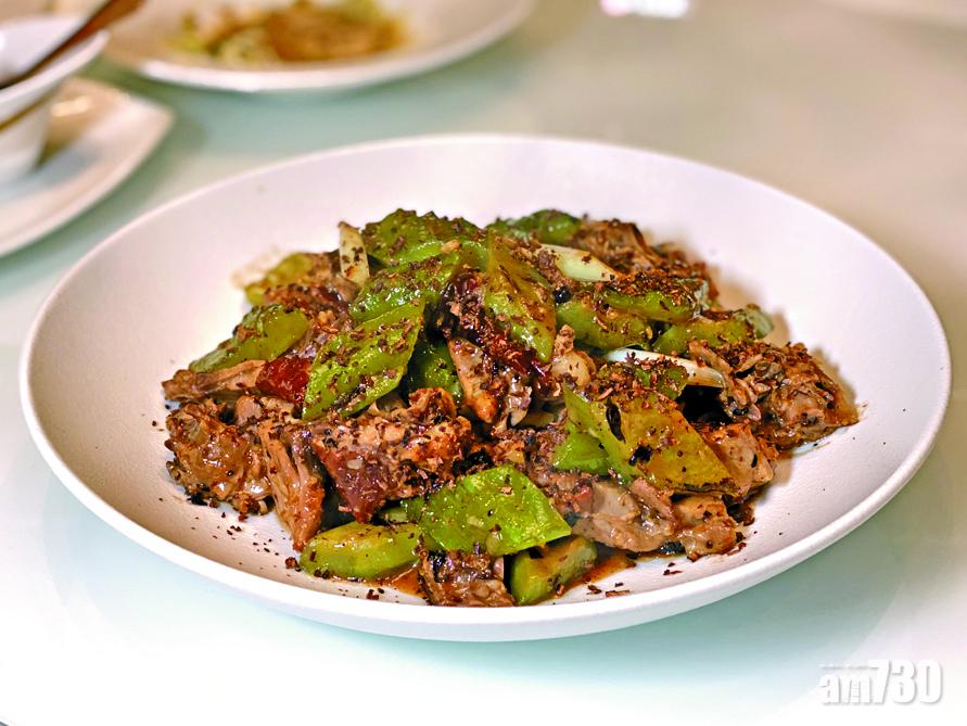 萬豪片皮鴨$888(只限晚市,需一天前預訂)──我這個鴨癡,竟然忽略了這裡的片皮鴨,幸好有心不怕遲,我敢講,Jayson的片皮鴨質素足以揮低很多名店,外皮烤得極脆入口酥香,色澤紅潤油香足,而鴨髀保留原隻上碟,可以一手拿來吃,一場鴨髀爭奪戰在所難免。配料選擇有齊砂糖、海鮮醬、檸檬汁、酸梅醬、甜酸菜、奇異果、蜜瓜與京蔥,逐樣試試發現其中的甜酸菜配搭很巧妙,酸度足以令你吃多兩件,而二食的陳皮涼瓜炒鴨殼亦誠意十足,絕不欺場。