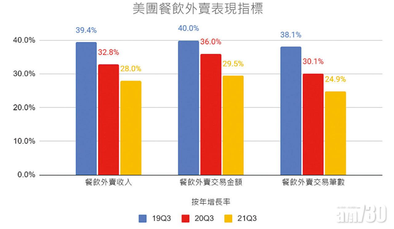 虧蝕的原因有四。首先是收入增長放緩,佔總收入超過一半的餐飲外賣業務尤其明顯。以過去三年的第三季為例(見圖),無論是收入、交易金額以至宗數,按年增長率均呈下跌趨勢。若將期內餐飲外賣收入除以餐飲外賣交易金額,得出的變現率是13.4%,較去年同期略為下降0.2個百分點,反映變現能力稍為轉弱。