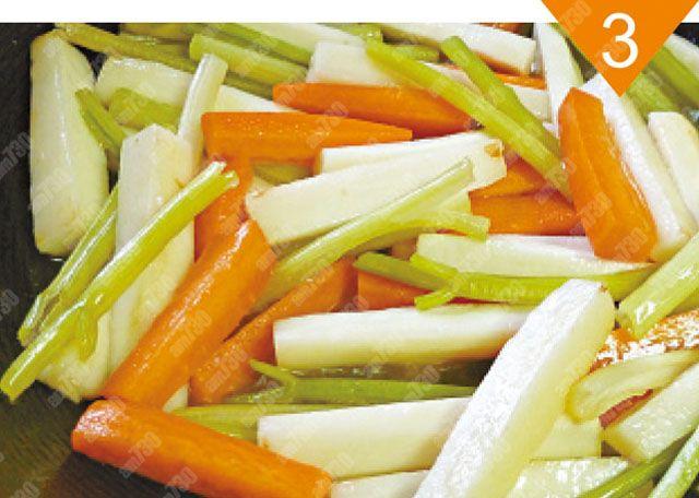 3.燒熱2湯匙油,放入鮮淮山及甘筍炒片刻,加水4湯匙炒勻冚蓋煮2分鐘,加入唐芹,洒鹽調味炒勻後盛起。