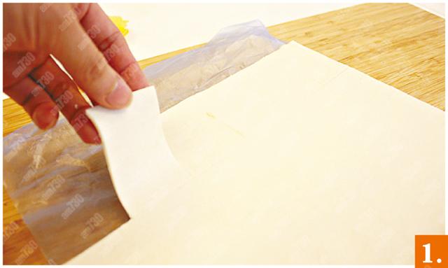 造法:1.酥皮解凍,切成6塊約2吋 x 3吋的長方形;2.芝士切成6小片,放於酥皮上;3.再將一片芫荽放於芝士上;4.放上腸仔,捲起,收口; 5.用刀在酥皮上輕力壓出坑紋; 6.在表面塗上蛋漿。7.放於焗爐以180度焗15分鐘。