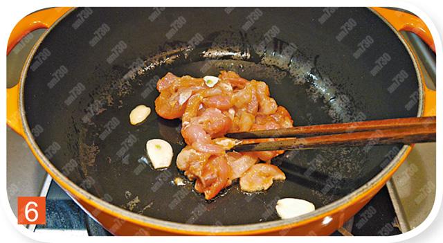 6.燒熱易潔鑊,下油,炒香蒜片,放入瘦肉絲炒至半熟,加入老抽、糖、清雞湯及水,拌勻,再煮滾。