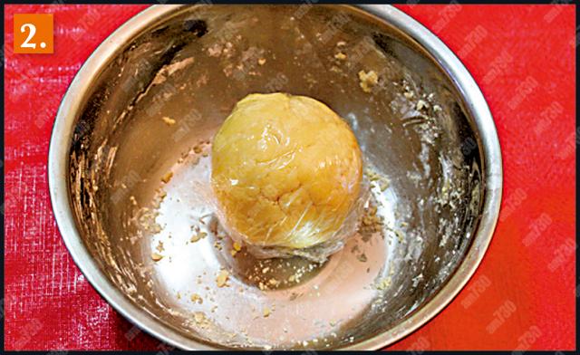 3.牛油室溫放軟,加入糖霜和蛋漿拌勻,加入低筋麵粉搓成麵糰,用保鮮紙包好,放入雪櫃冷藏30分鐘。