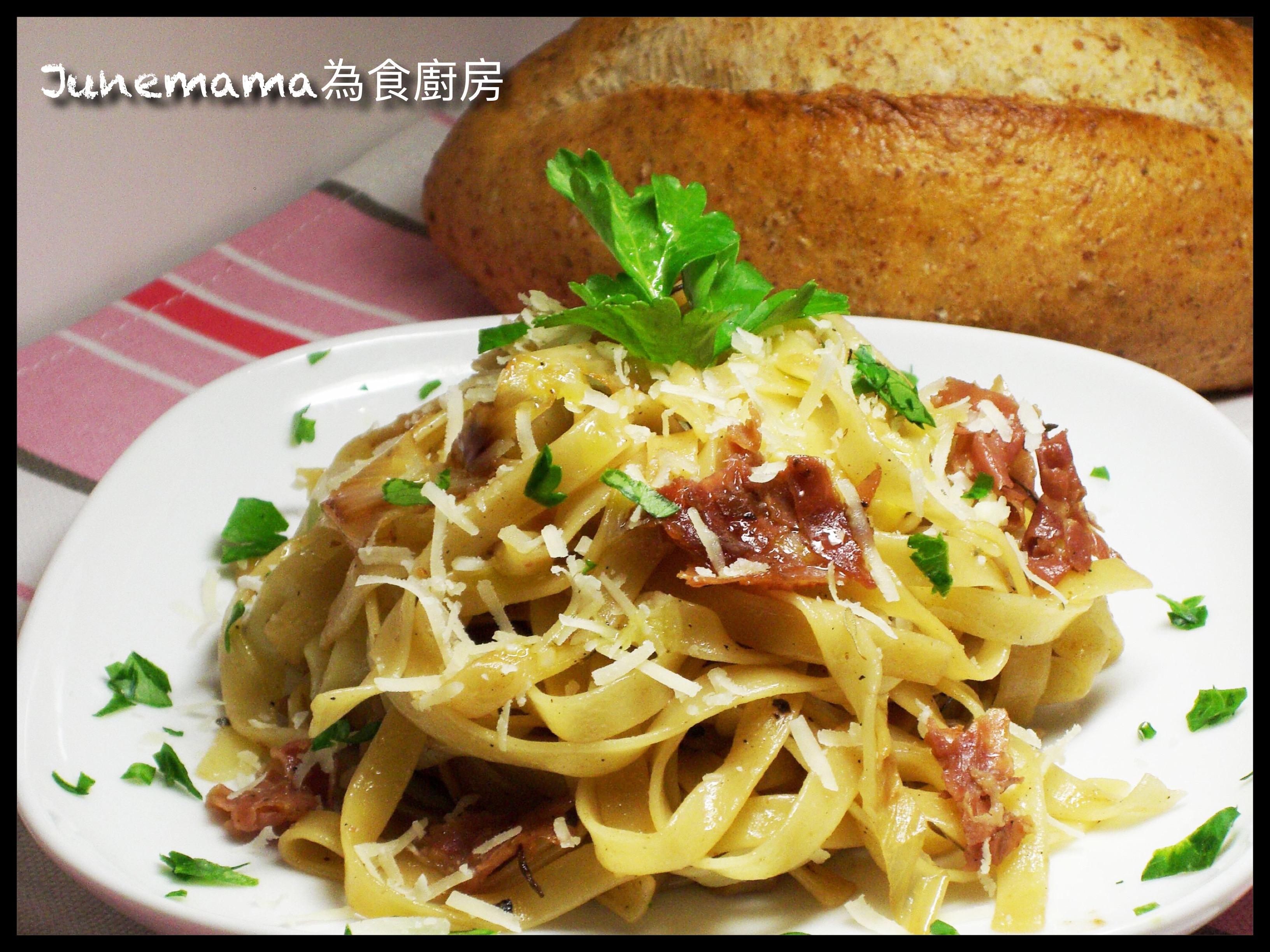 圖3:放上巴馬火腿,再加入帕爾馬芝士碎及牛油,炒香