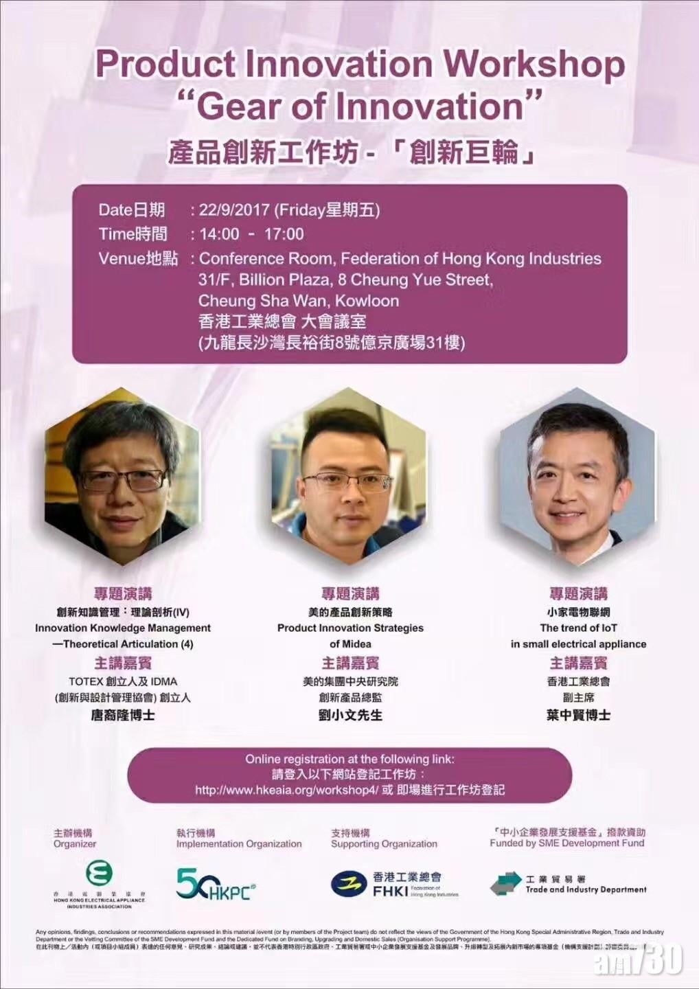 剛剛在9月22號圓滿結束的<產品創新工作坊--創新巨輪>,是由香港電器業協會主辦,由香港工業總會協辦,由香港工業貿易署支援基金撥款資助,由香港生產力促進局作為執行機構的最後一場本年度工作坊論壇,此論壇反應熱烈,正正說明瞭全新的大時代己悄然來臨,並正以無人可以阻擋的巨輪,滾滾而至:物聯網(LoT),大數據分析及應用,人工智慧,人臉識別,遠程式控制制,電器電子化,家居智能化,超市無人化,資源共用化等等等......,這些改變,說明瞭世界需要創新,國家需要創新,企業需要創新!