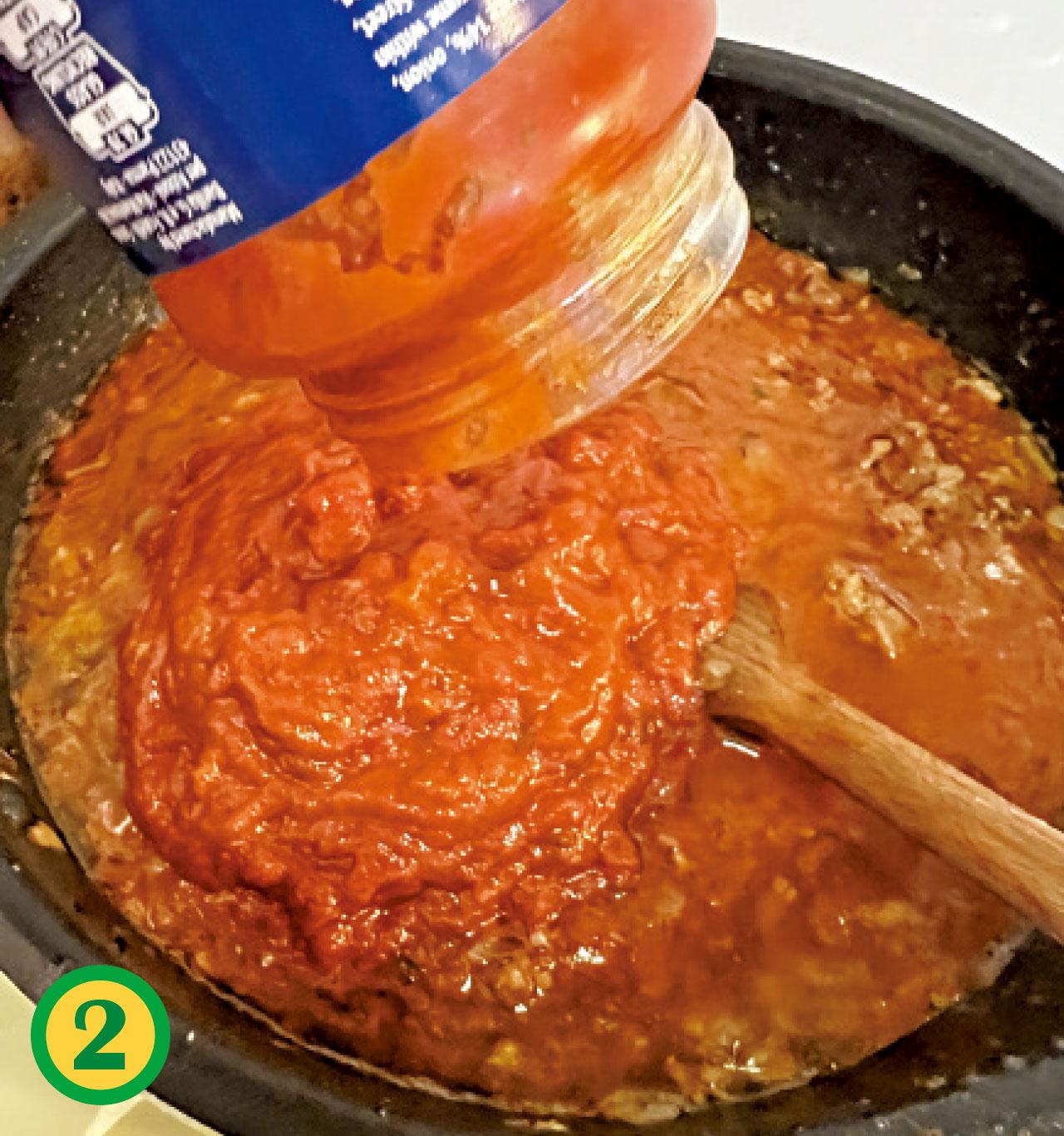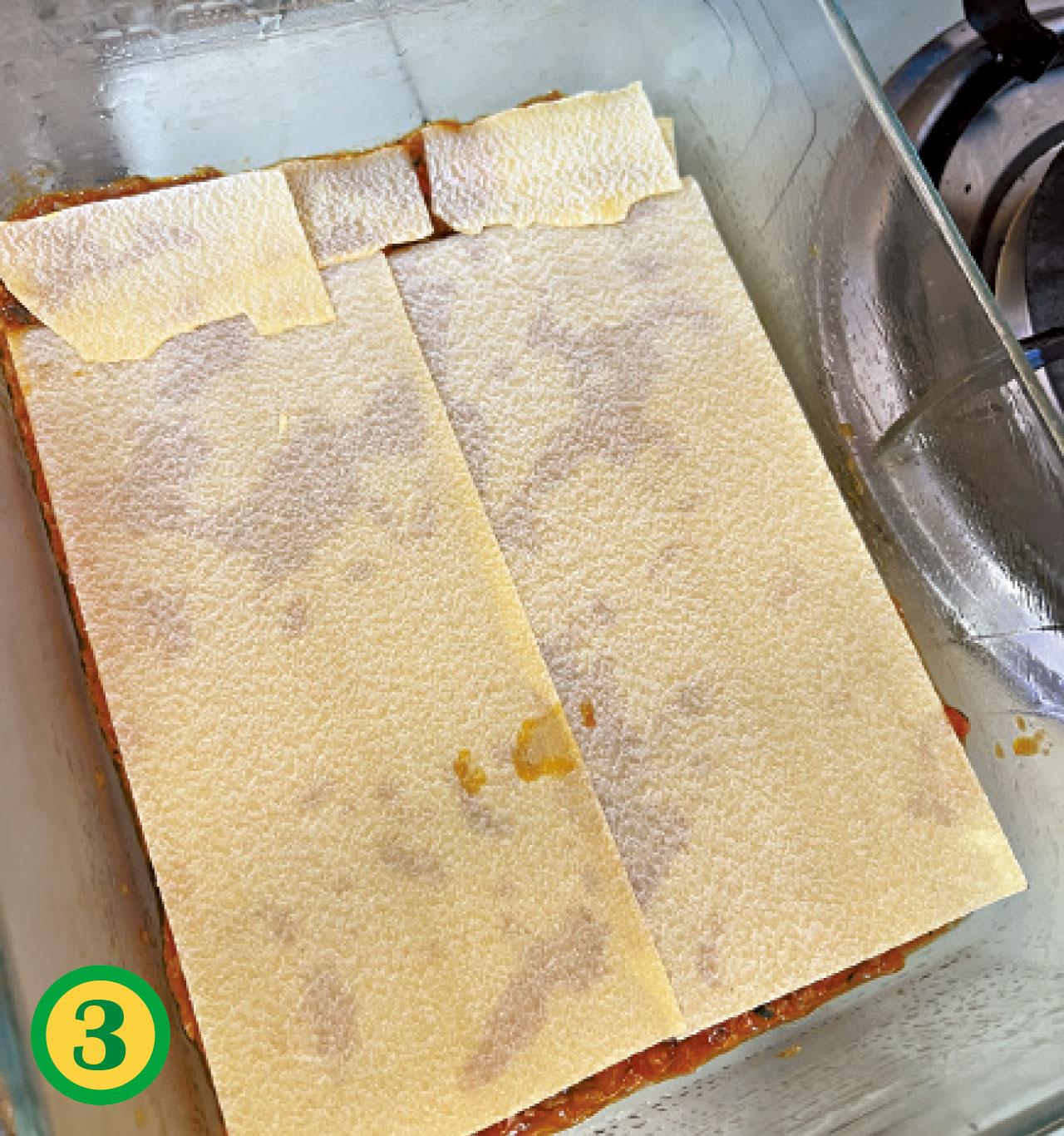 把一個洋蔥切碎,炒香,加入解凍了的優質漢堡扒四塊,把肉壓碎,加入香草、香料、胡椒、鹽、糖、番茄醬,試味,關火,備用。焗爐預熱至攝氏180度。深烤盆內抹點橄欖油或融化牛油,先鋪上番茄肉醬,再放上一層闊麵,之後是白醬(金寶忌廉湯),再來一層薄薄的mozzarella芝士,之後再來肉醬、麵、白醬、芝士……重複數遍,最後,再表面鋪上肉醬,然後是mozzarella和芝士粉(條件許可的話,在mozzarella表面灑上Grana Padano或Parmigiano-Reggiano)。之後用錫紙蓋好,放進焗爐烤半小時,最後移除錫紙,烤至表面金黃即可。倘若中途鋪醬汁時調亂了次序也不要緊,記緊麵與麵之間要有足夠的醬汁分隔就好了,不然幾層麵糊在一起就不好吃了。