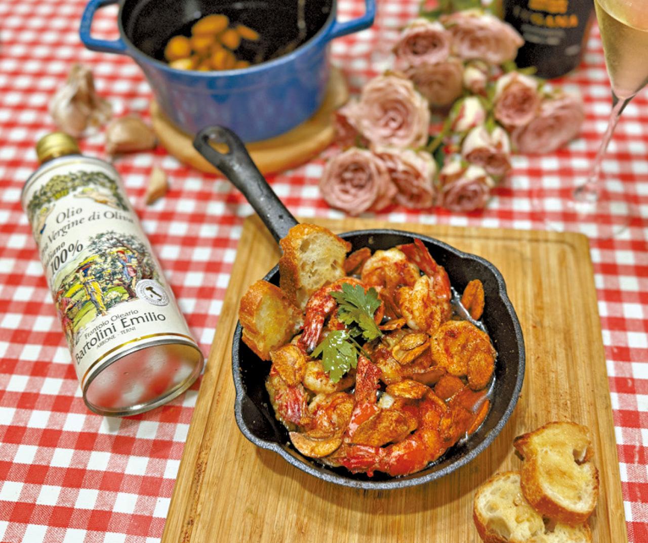 這是一道著名的西班牙佐酒小食Tapa/Tapas,做法極簡單也極受歡迎。配以西班牙式的陶製盛器當然最好,但以鑄鐵小鍋作盛器上菜也很不錯。碰巧休漁期剛結束,花竹蝦上市,價格頗相宜,於是買來做此菜。將新鮮蝦剪去頭部,去殼。若想保留尾部的殼,須撕去尾部中間尖殼及剪去尾部最末端的殼,以防烹煮時爆油、產生意外。之後以刀子開蝦背,去除泥腸。可以少許胡椒及鹽將蝦調味。備生蒜數瓣,去皮,縱切成片,不用太薄,以免太易焦掉。預備數瓣煮好的油浸大蒜,壓爛成蓉。鍋中燒稍多的橄欖油,爆香蒜片,金黃即撈起,放進鮮蝦,蝦捲曲變紅即關火,拌入油浸大蒜蓉、灑上蒜片及少許西班牙煙熏紅椒粉(沒有的話可用乾辣椒碎),即時原鍋上桌。配以切片麵包更佳。做此菜橄欖油要用多量,才能以油泡出鮮嫩的蝦肉,也好作麵包蘸料。