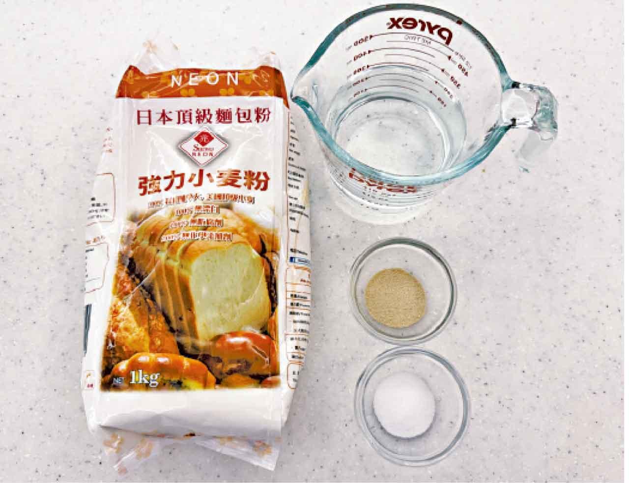 做麵糰:將麵糰材料混合,先把麵粉的在大碗中,倒鹽在麵粉左旁,再將酵母放麵粉右邊,目的是避免酵母直接接觸鹽,以確保酵母的活躍能力。倒進暖水,攪拌至成一團,倒出放工作枱面,再揉搓至表面光滑的麵糰。用手或攪拌器做都可以。此時將一個大碗薄薄塗上一層油,放入麵糰,在表面薄敷一層油,以保鮮紙封好,放雪櫃冷藏(chill)一夜或12小時。