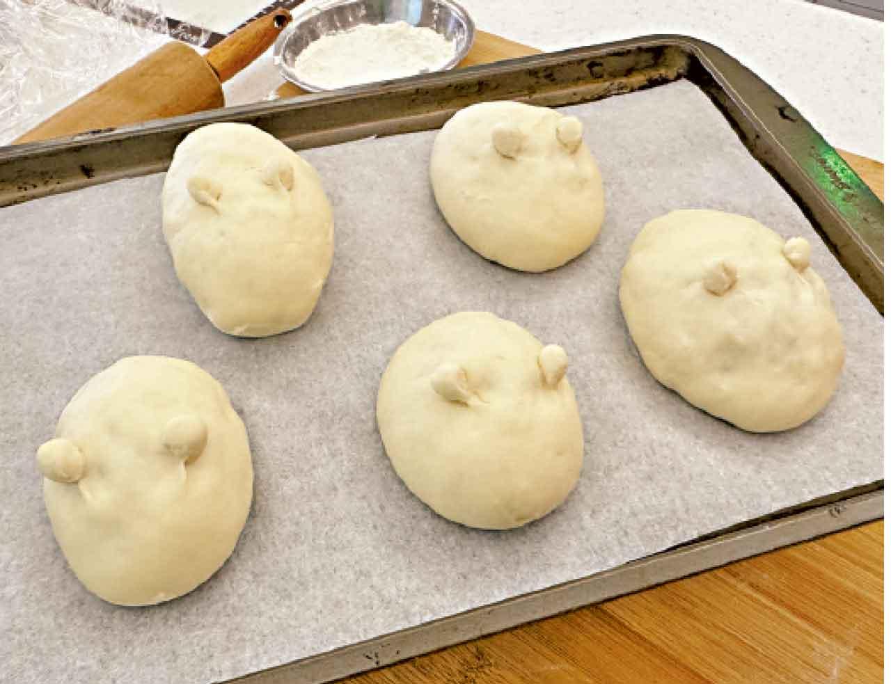 我採用市售豆沙為餡,若你有時間可做些卡士達Custard餡,那就更配合復活節這主題了。麵糰方面我用一個簡單的白麵糰方子,再以長時間低溫來發酵,使麵糰鬆軟而風味細緻。這麵包很容易上手,很適合跟孩子一起動手做。