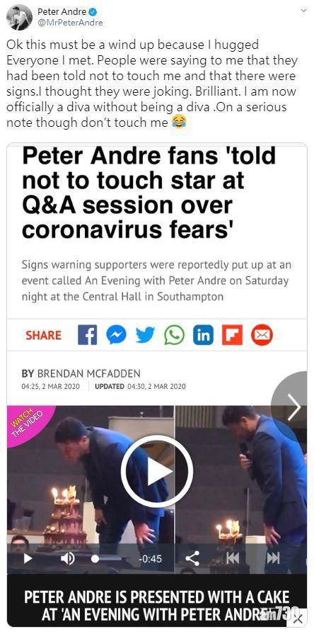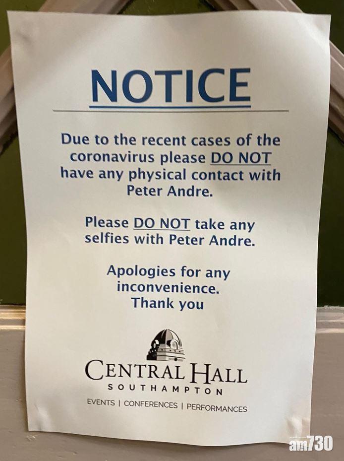 澳洲歌手Peter Andre上月29日在英國南安普敦(Southampton)舉行見面會,但因新型冠狀病毒肺炎肆虐,粉絲與偶像的互動一律禁止。場內告示提醒粉絲:「由於最近有新型冠狀病毒肺炎,請不要與Peter Andre有任何身體接觸」及「請不要與Peter Andre自拍。不便之處,敬請原諒。謝謝」,引發熱議。有粉絲向傳媒指不滿安排,她說:「他以為自己是誰?連英女王都沒有提出這樣的要求。」Peter Andre後來在Twitter澄清,指自己未曾要求大會作出這樣的安排,更不知有告示提醒粉絲。