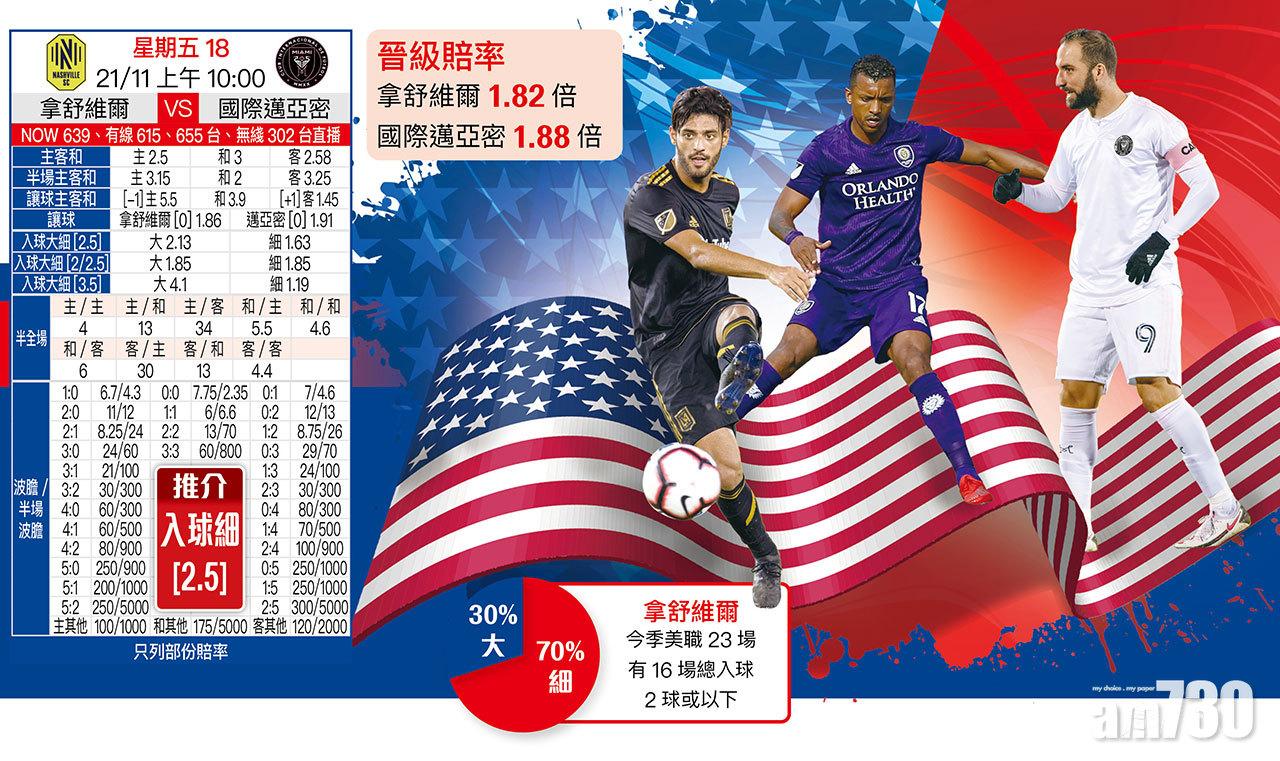 美職季後賽在香港時間周六早上開鑼,一眾球星領軍捉對廝殺,力爭總冠軍。兩支新軍在東岸資格賽相遇,國際邁亞密火力不穩,出征守力驚人的拿舒維爾難越雷池半步,博入球細。