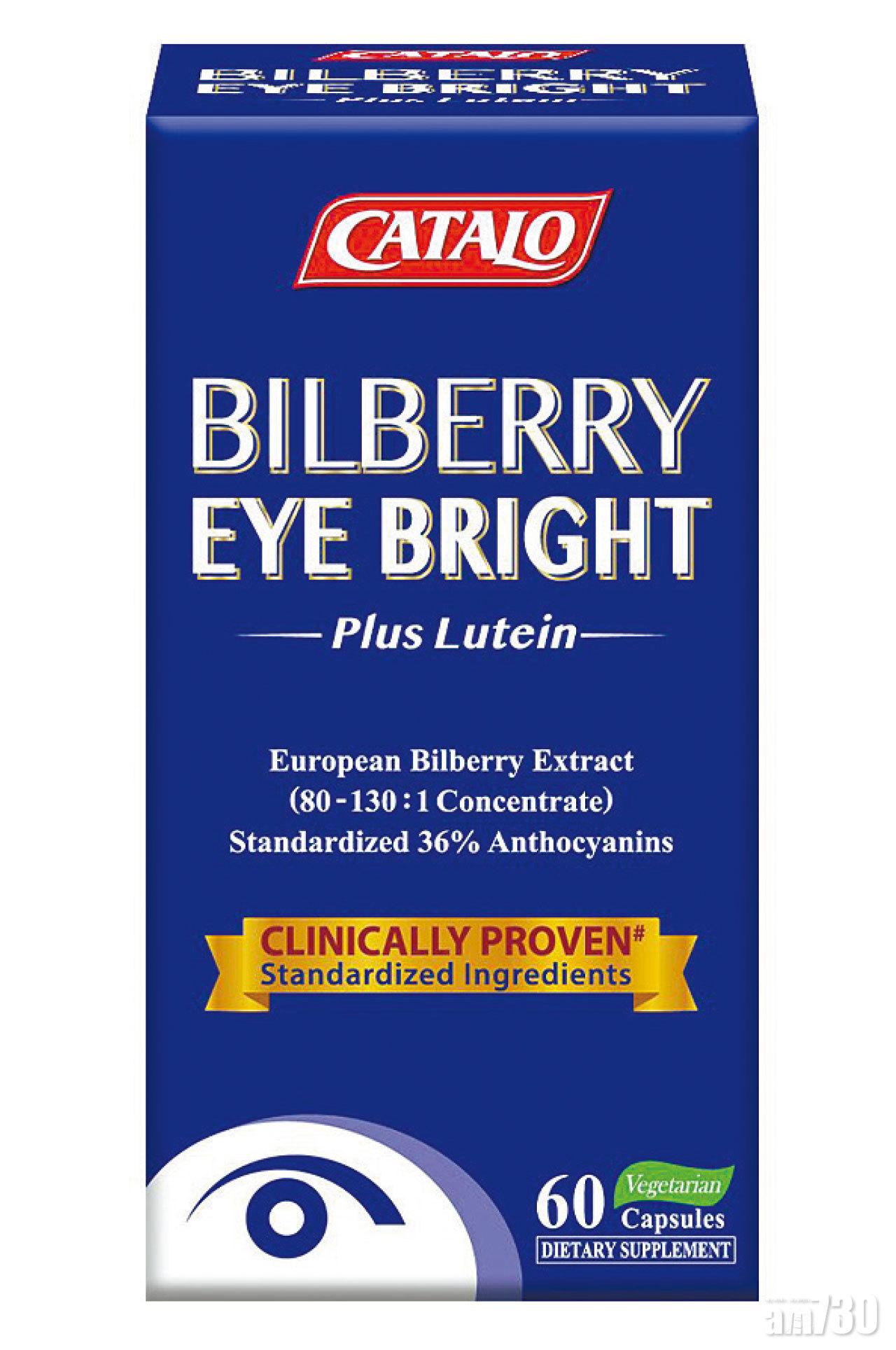 CATALO皇牌護眼藍莓精華(添加葉黃素)每粒含有80毫克(80至130倍濃縮)優質天然高濃縮Mirtoselect®北歐野生藍莓(Bilberry)精華,其花青素含量標準化36%,能有效令眼睛視紫質再生,促進視覺敏銳度,令視覺影像清晰,延緩老花。