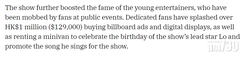 同時,報道也指出劇集令演員人氣急升,Anson Lo的忠粉更豪擲逾一百萬港元($129,000),購下巨型廣告、電子廣告等為偶像慶祝生日。
