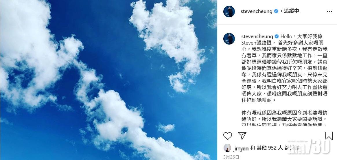張致恒一家被揭負債纍纍,他的老婆雯雯事後在網上多次大吐苦水,反遭網民指「債仔惡過乜」,並著雯雯外出打工還錢。其後張致恒在網上發文承諾會努力工作還錢,並開腔護妻,坦言雯雯因為要照顧兩個小朋友已經很大壓力,情緒不好。