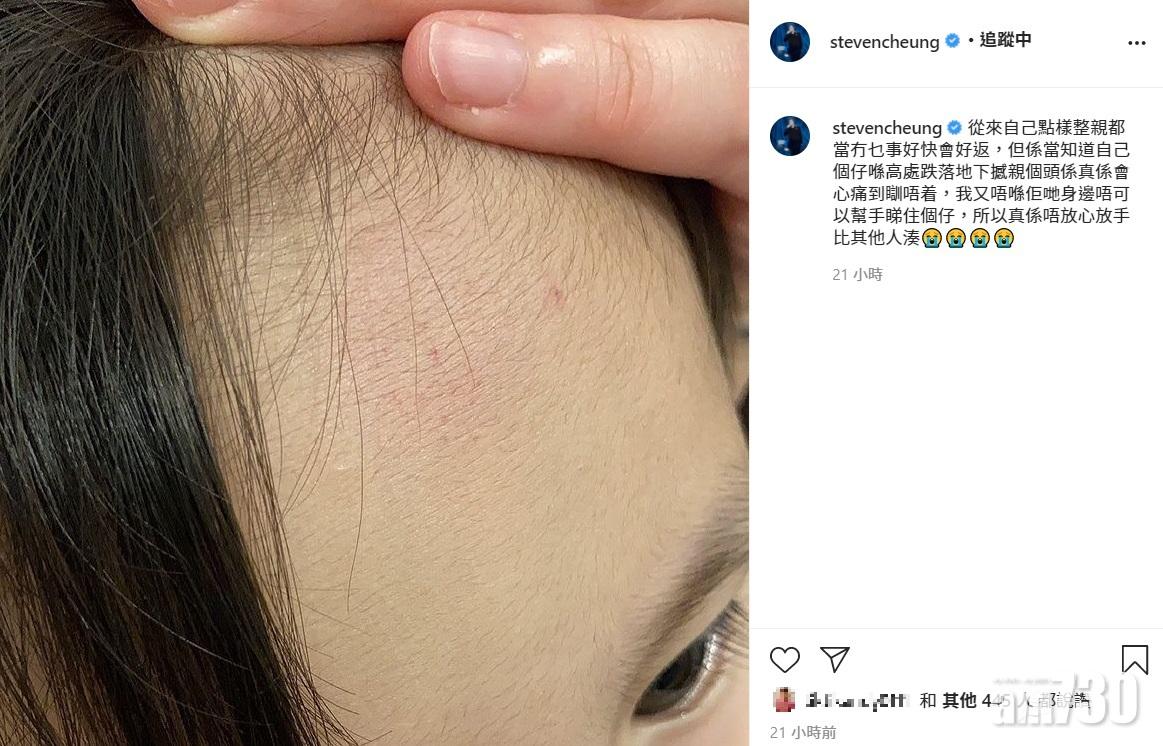昨日他在社交平台上載囝囝額頭紅了一撻的照片,心痛囝囝受傷。他留言說︰「從來自己點樣整親都當冇乜事,好快會好返,但係當知道自己個仔喺高處跌落地下撼親個頭,係真係會心痛到瞓唔着,我又唔喺佢哋身邊唔可以幫手睇住個仔,所以真係唔放心放手比其他人湊。」