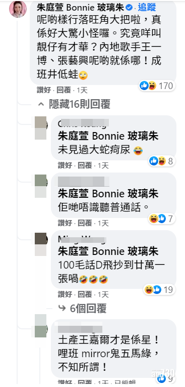 有專頁上載了一張以「6場MIRROR演唱會終於嚟到尾場啦!你最大感受係乜?」為題的截圖,下面顯示4個不同投票結果,包括︰「香港終於有偶像啦!」、「姜濤真係好靚仔!」、「十二人缺一不可!」及「一代不如一代,真係冇興趣!」,而參與討論的網民都近乎清一色指不認識MIRROR,又謂「完全吾知呢班係咩人,亦冇興趣知,只係係麥當勞同FB成日見到呢班不男不女既騎喱生物、九吾搭八」等。當中以玻璃朱的留言獲最多人讚,她寫道︰「呢啲樣行落旺角大把啦,真係好大驚小怪囉。究竟咩叫靚仔有才華?內地歌手王一博、張藝興呢啲就係哪!成班井低蛙。」不少網民附和她的言論,並例出多位中國歌手名字,指他們比MIRROR更高質素。