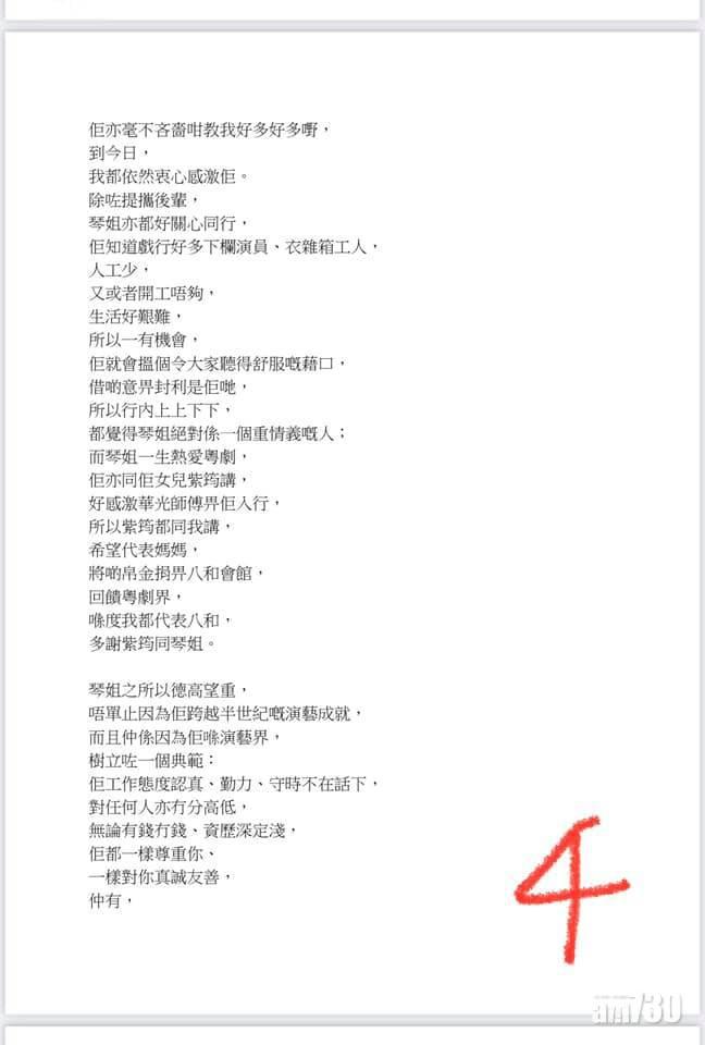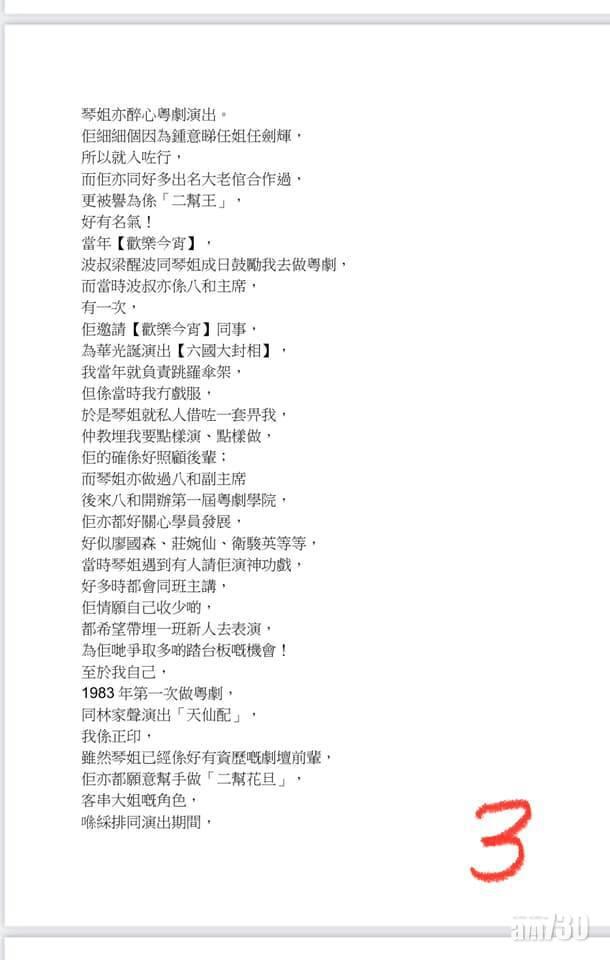 於1971年加入TVB的汪阿姐坦言,起初對琴姐印象停留於與琴姐相識相知多年的汪明荃任,儀式舉之後,汪阿姐把完整黑白粵語片的「西宮」模樣,直至在《歡樂今宵》真實相處,驚覺琴姐多才多藝又風趣幽默。及後,首次合作拍劇集《永恆的春天》,見證琴姐「改邪歸正」由奸妃變賢母。而她最感激是琴姐在她往粵劇界發展,對她的提攜與支持。最後,她憶述5年前探望琴姐時,齊齊唱粵曲的歡樂時光,她表示,「其實我真係唔太肯定佢仲記唔記得我, 但係我,一定唔會忘記,喺我嘅演藝路上,曾經同一位咁值得我學習同尊重嘅前輩共事過,能夠同你認識同合作,係我嘅榮幸。琴姐,一路好走,晚輩永遠懷念。」