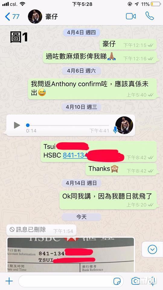 程美段看完阿澤在Facebook的回應後,就把她與負責出糧的豪仔WhatsApp對話公開,她指1月22日為阿澤的節目進行所有拍攝,及至4月初她曾向豪仔聯絡出糧事宜,可惜對方一直沒有回覆直至10日才獲對方一個口訊。她寫道︰「我都係一個要不斷接Job去生活嘅小藝人,如果長達兩個星期入面嘅查詢只係得到一次回覆,焦慮都係一個人之常情。」並詳細列出整件事的時間表,她說︰「如果我等足三個月都未收到錢,仲長期比對方已讀不回,咁都叫搏見報,咁我程美段道歉,係我多口向記者講,抱歉,對唔住。」
