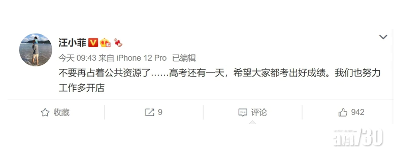 台灣女星徐熙媛(大S)與汪小菲鬧傳離婚風波仍未平息,汪小菲連日來在微博發文隔空傳情,日前發文稱「我老婆是第一」但很快又刪除帖文。昨日他又在微博分享一首歌曲《Leave Before You Love Me》憑歌寄意,今早他便寫下:「不要再佔著公共資源了……高考還有一天,希望大家都考出好成績。我們也努力工作多開店。」不過,帖文又很快刪除。