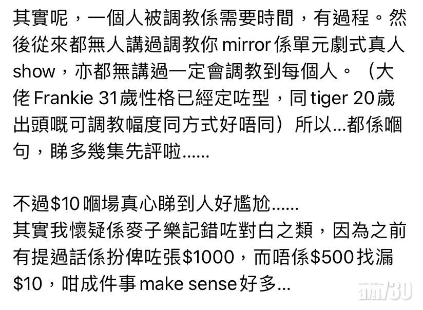 節目以麥子樂的辛酸史,鼓勵隱形成員關鍵在於態度,但粉絲似乎不太收貨,不少粉絲在不同的討論區留言,直指整蠱環節莫名其妙,亦看不到對Frankie有何調教,對「頒獎」環節感非常突然,欠缺互動回應,但亦粉絲認為要耐心等待,睇完20集才作評論。