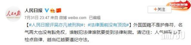 《人民日報》微博昨日發文稱︰「法律面前沒有頂流:外國國籍不是護身符,名氣再大也沒有豁免權,誰觸犯法律誰就要受到法律制裁。請記住:人氣越高越要檢點自律,越當紅越要遵紀守法。」看來吳亦凡今次凶多吉少了。