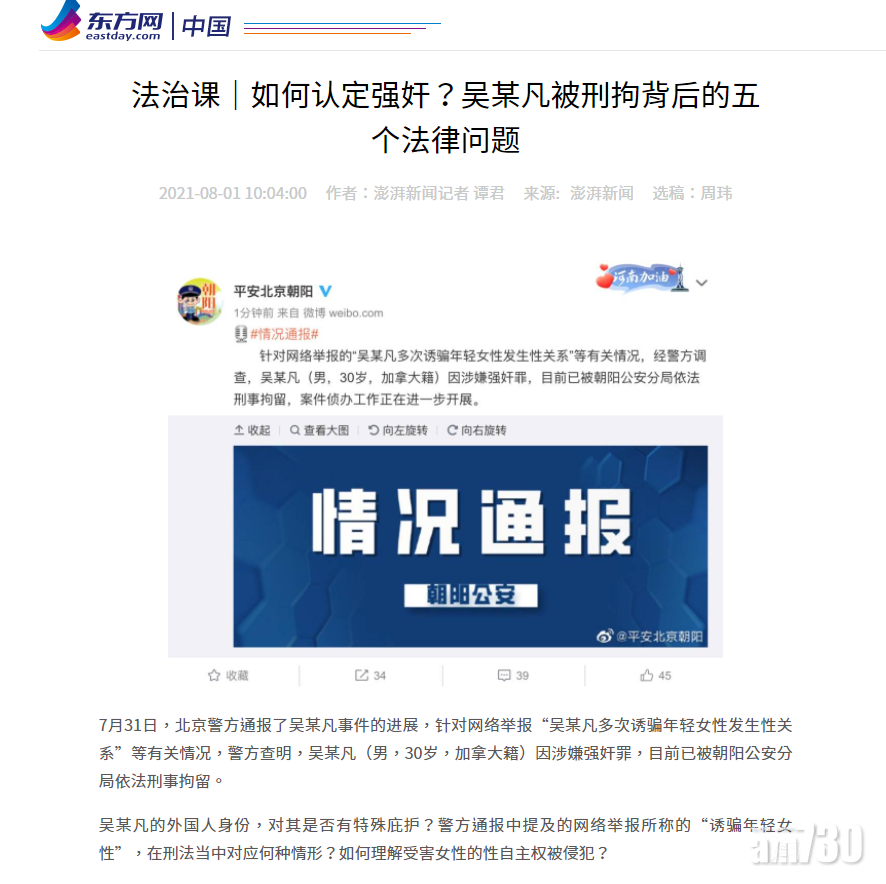 大陸多個網站就吳亦凡將面臨的法律問題撰文。