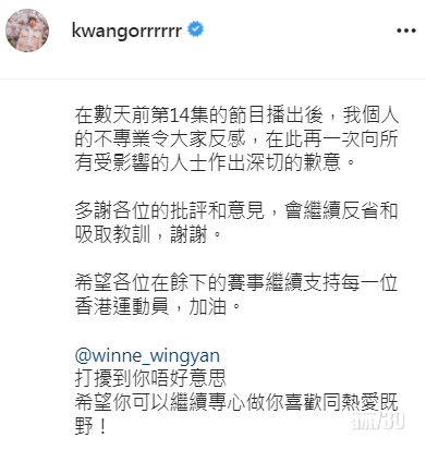 今日坤哥在社交平台撰文公開道歉,他寫著,「本人吳業坤現為在《東京五輪直送》節目中跟洪詠甄小姐於練習後訪問的失言作出道歉。事發在開幕禮前洪小姐練習後完成圍訪後,在她離開前做了一個突發的訪問,當刻未能好好處理內容及表現不專業,拍攝後自覺對她感到抱歉及怕令到感到不尊重,當晚已即時親自direct message(DM) 中向她致歉。在數天前第14集的節目播出後,我個人的不專業令大家反感,在此再一次向所有受影響的人士作出深切的歉意。多謝各位的批評和意見,會繼續反省和吸取教訓,謝謝。希望各位在餘下的賽事繼續支持每一位香港運動員,加油。」網民大致對坤哥的道歉收貨,認為他算是有誠意,但亦有指他被鬧爆才肯道歉。至於另一位主持周奕瑋,暫時未見他公開回應。