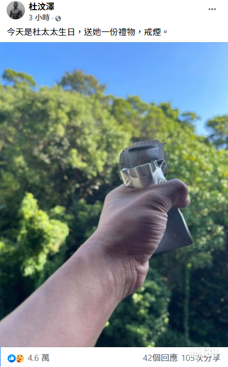 今日是田蕊妮44歲生日,身在台灣的杜汶澤今日上載手揸煙包的照片,留言說︰「今天是杜太太生日,送她一份禮物,戒煙。」阿澤的好友留言表示自己戒了年幾,健康也自動改善,並指戒煙的確是送給太太的好禮物。另外,有朋友留言稱以為阿澤拿住的是飛機杯,引來不少人給予哈哈笑表情。