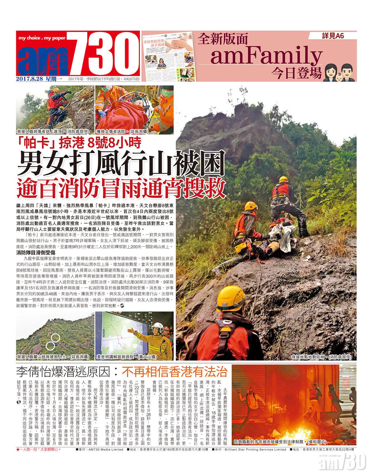 繼上周四「天鴿」來襲,強烈熱帶風暴「帕卡」昨掠過本港,天文台懸掛8號東南烈風或暴風信號逾8小時,亦是本港近半世紀以來,首次在4日內兩度發出8號或以上信號。有一對內地男女前日(26日)在一號風球期間,到飛鵝山行山被困,消防處出動過百名人員通宵搜救,一名消防隊目受傷,至昨午救出該對男女。當局呼籲行山人士要留意天氣狀況及考慮個人能力,以免發生意外。