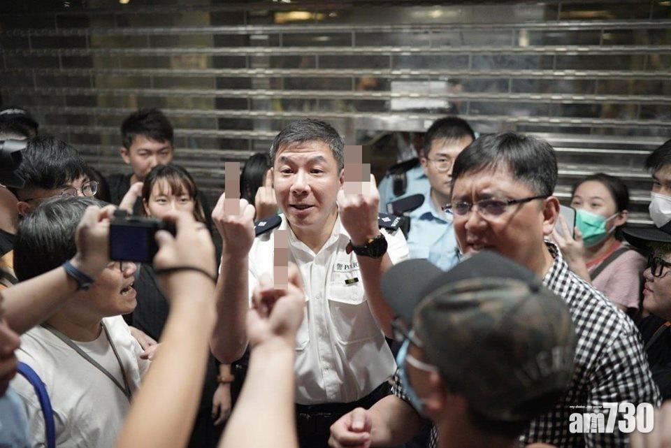 至凌晨,助理指揮官麥子強步出天水圍警署門外與示威者理論,期間雙方發生激烈口角,有人向麥子強做出不文手勢,麥見狀雙手舉起中指回應,又反問示威者:「依個咩手勢嚟㗎?」期間,有人出言辱罵麥子強是「狗」,麥不忿被示威者辱罵,回應稱:「我係狗,你哋都係曱甴咋」,言論一出示威者再度起哄。