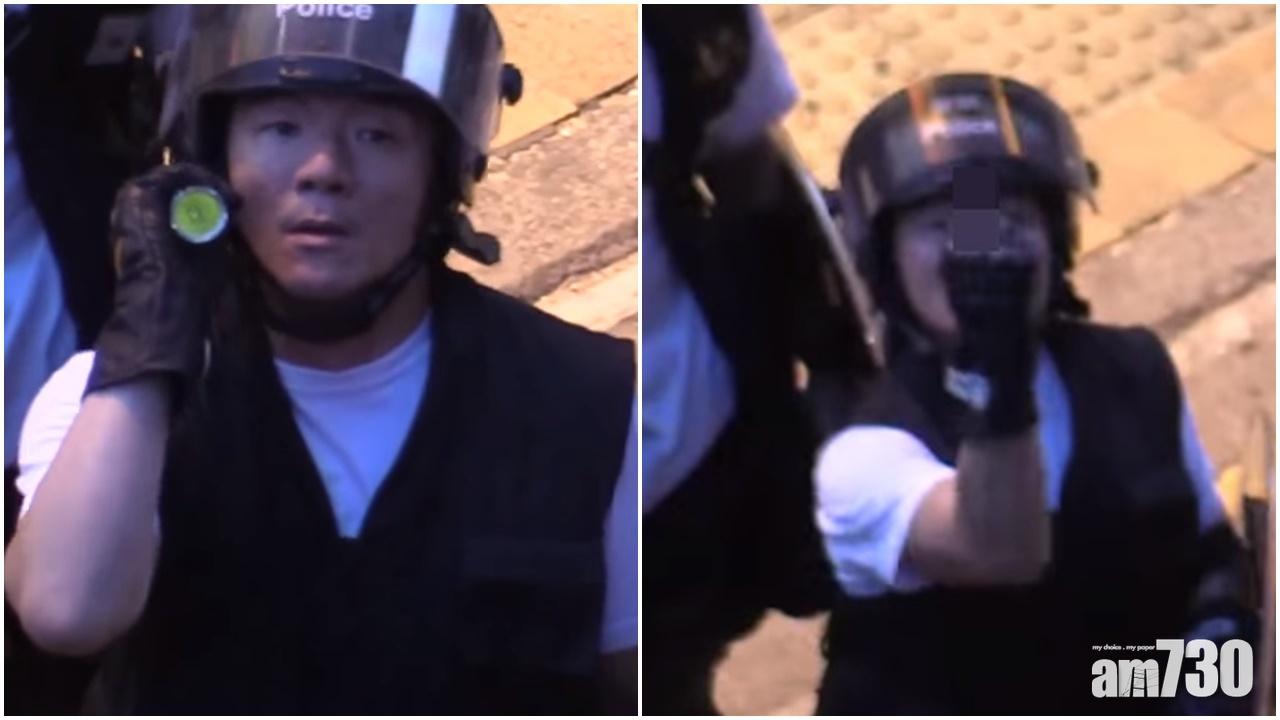上周日(28日)中西區衝突中,有警員向記者投射強光疑阻礙採訪,又向鏡頭舉中指。(網上片段截圖)