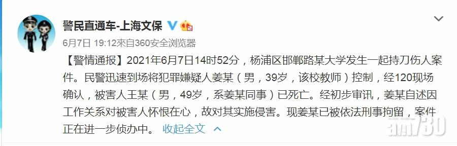 上海復旦大學周一發生兇殺案,該校數學學院姓姜教師疑因工作問題,持刀殺害該學院黨委姓王書記,當場被捕。網上流傳拘捕現場短片,只見姜男跪在地上,雙手被手扣反鎖在身後,滿身血污,右衣袖被扯爛。警方詢問行兇動機時,姜男聲稱是長期被王書記陷害、惡劣對待,又指自己是直接從住所到學院行兇。
