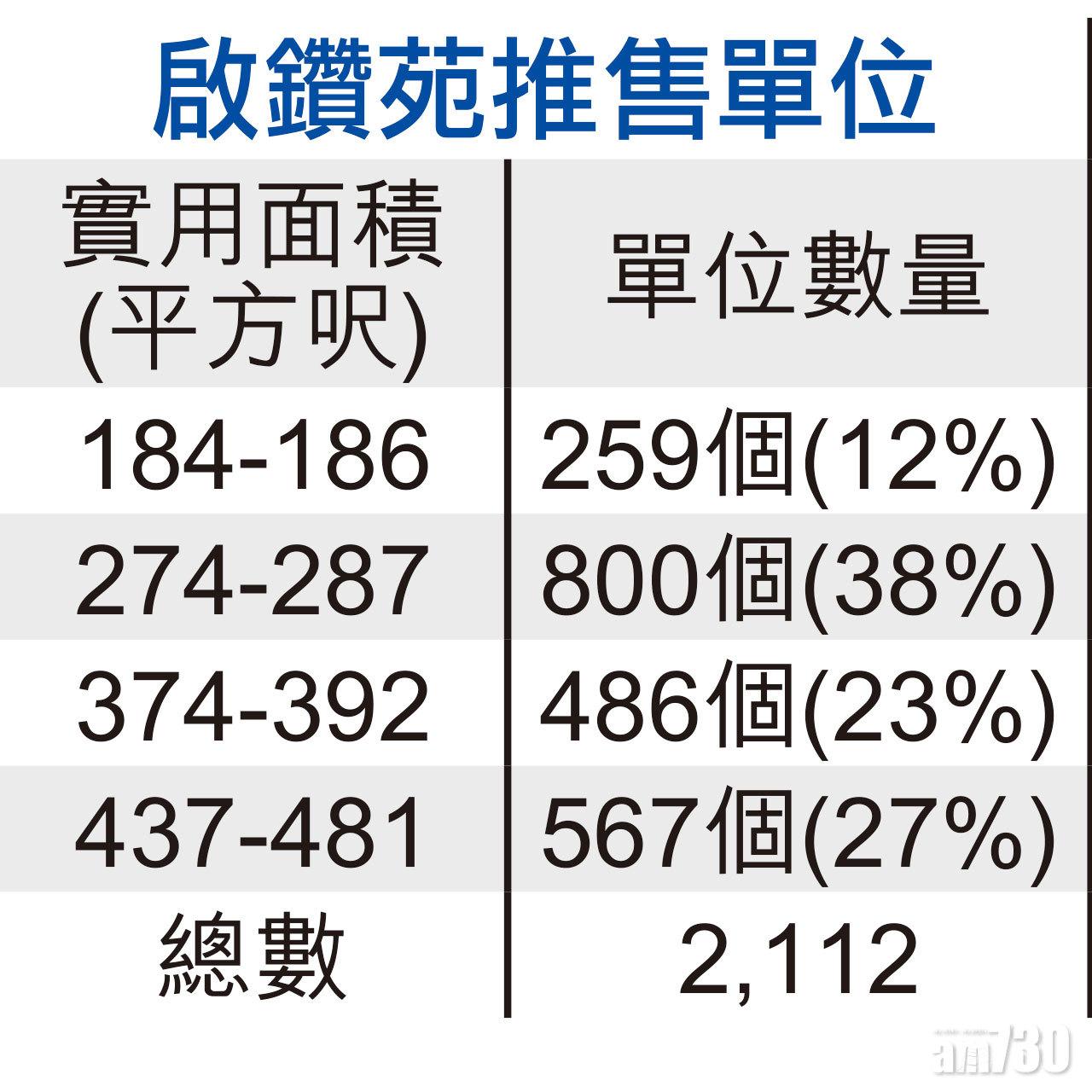 今期綠置居「啟鑽苑」鄰近港鐵鑽石山站,涉及2,112伙單位,單位實用面積由184至481方呎,當中以274至287方呎單位最多,佔38%,其次為437至481方呎的大型單位,亦佔27%(見表)。房委會建議平均呎價約7,390元,售價定於118萬元至385萬元,約市價五折。由於綠置居最高造有95%按揭,買家只付5%首期,即約59,000元便可上車。