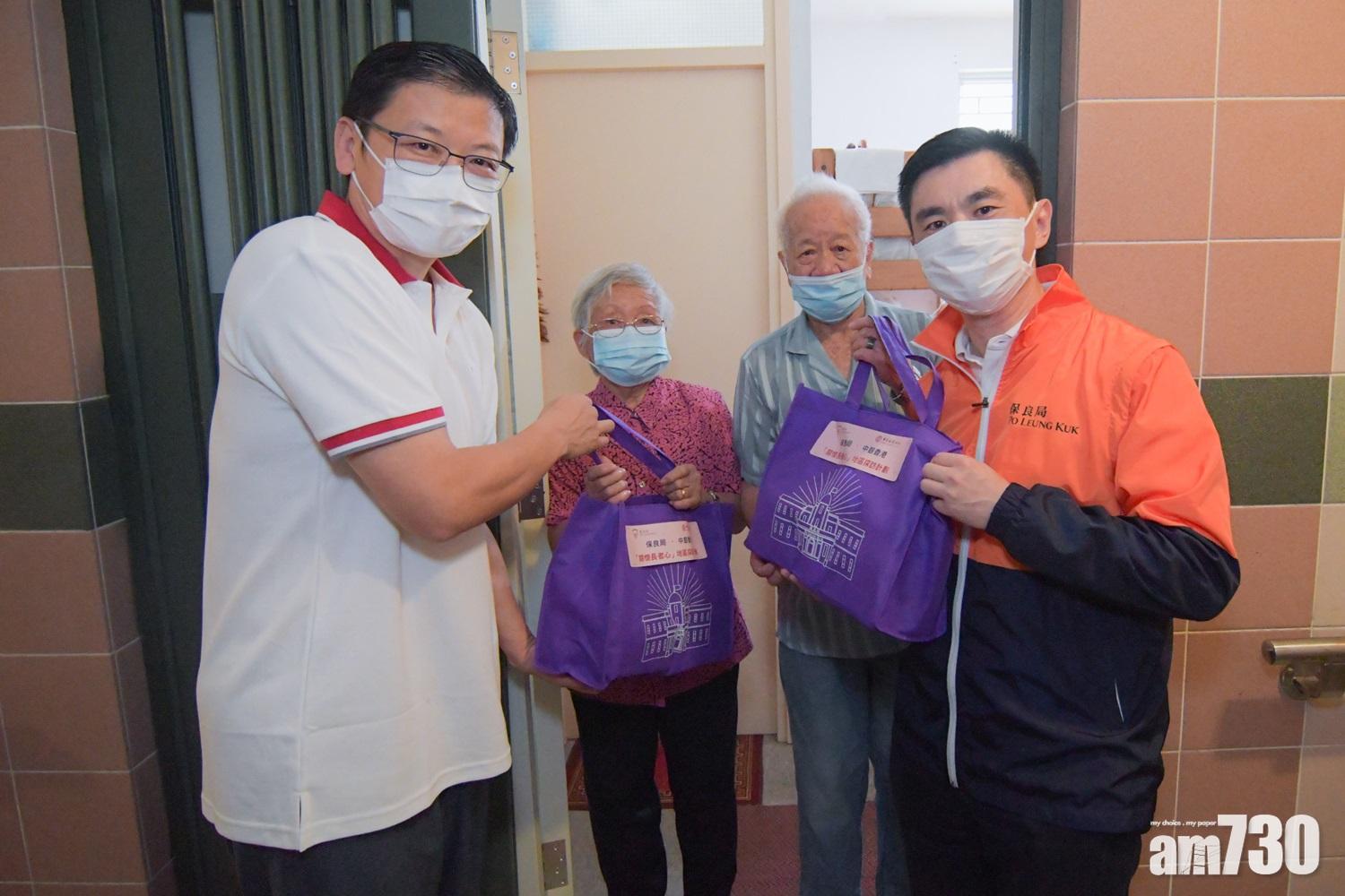孫煜(左1)與林潞(右1)帶領義工隊,探訪長者,向對方送上祝福及福袋。