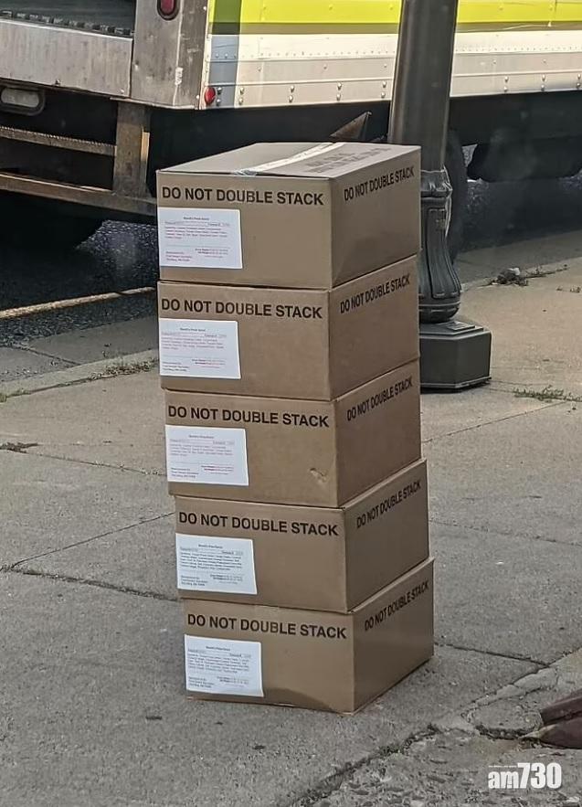 美國送貨員無視「不要疊起」的溫馨提示,將紙箱重重疊高。(互聯網)