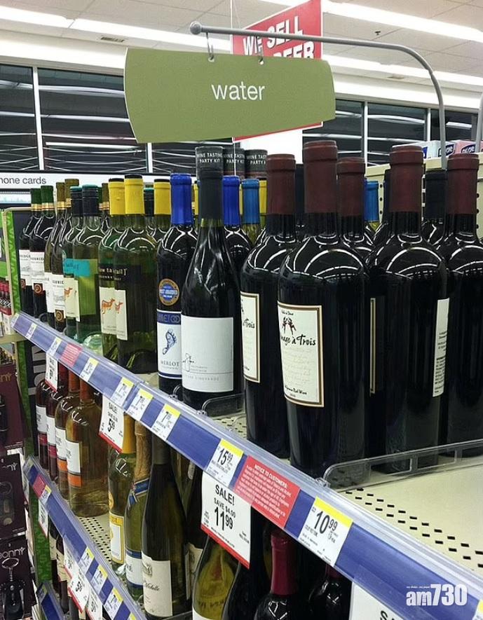 英國超市在「水」的貨品種類牌下放滿酒。(互聯網)