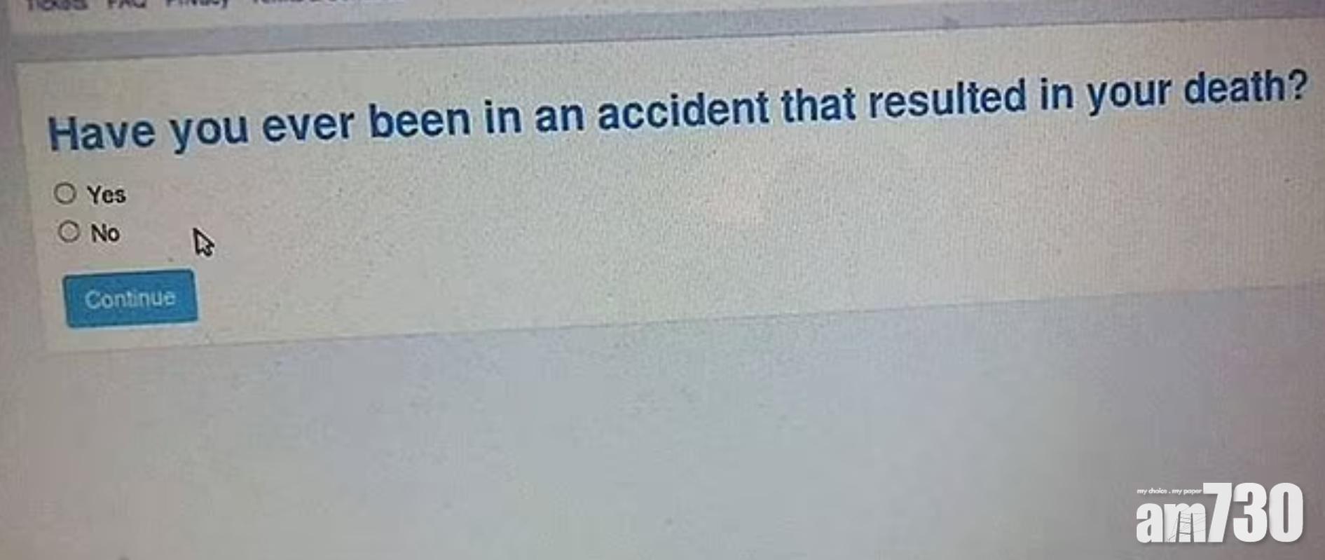 網上表格一條問題竟然問:「你曾經遭遇過導致你死亡的意外嗎?」(互聯網)