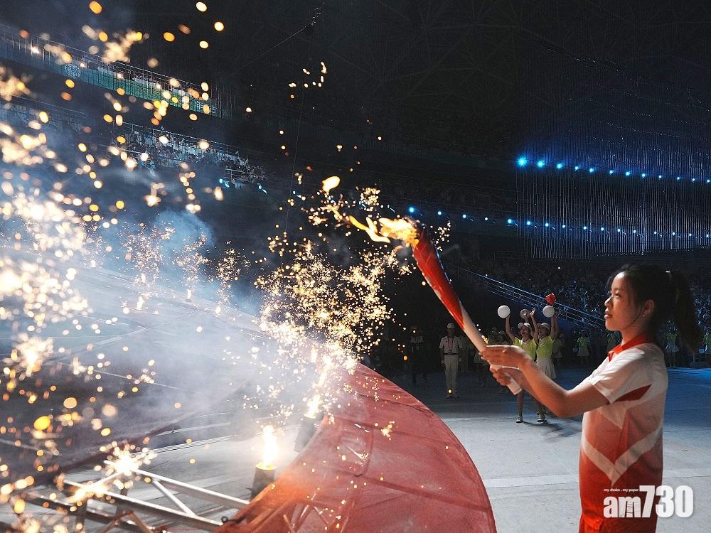 此外,全運會聖火在會場上經過「百米飛人」蘇炳添、東奧200米蝶后張雨霏、奧運跳水金牌秦凱、奧運射擊金牌郭文珺、奧運5金中國男乒球隊隊長馬龍傳遞後,由在東京奧運為中國代表團贏得首面金牌的年輕射擊運動員楊倩燃點主火炬。