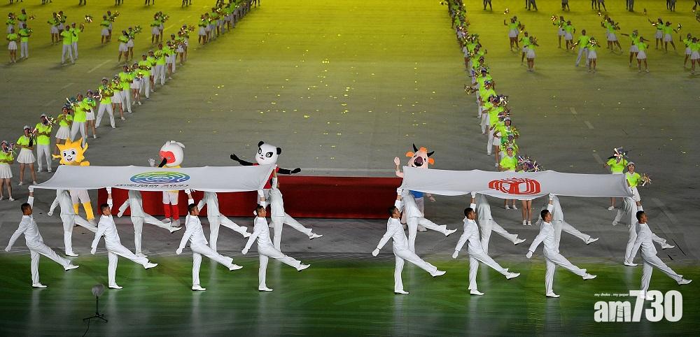 全國運動會會旗及第十四屆全運會會旗入場時,4隻「國寶級」吉祥物(旗後左至右)金絲猴「金金」、朱䴉「朱朱」、大熊貓「熊熊」及羚牛「羚羚」一同現身。(新華社)