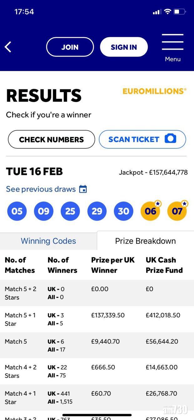 原來「歐洲百萬彩」的玩法,是要在1到50中買中5個主號碼(main numbers),再在1到12中買中兩個「幸運星」號碼(Lucky Star numbers),若全中可獲頭獎,二獎是「5主+一個幸運星」,三獎則是「5主」。Murray雖然在7個字中,選中了6個,但卻是「4主+兩個幸運星」,只屬4獎,只分得666.5英鎊(約7,270港元)。