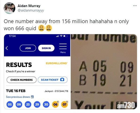 中六合彩固然高興,但只差一個字,所獲獎金由17億變成得返幾千蚊,應該笑定喊?英國24歲工程師梅利(Aidan Murray)早前買了「歐洲百萬彩」(EuroMillions)彩券,頭獎獎金有1.56億英鎊(約17億港元),結果他「幸運地」在7個字中,買中了6個!以為無頭獎都二獎,那就錯了。