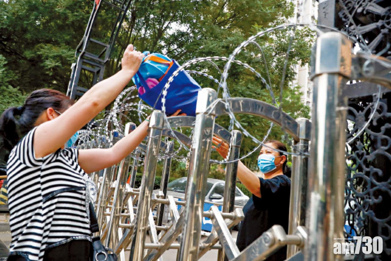 屋苑被封的居民隔著大閘接收親友送來的生活用品。(路透社)
