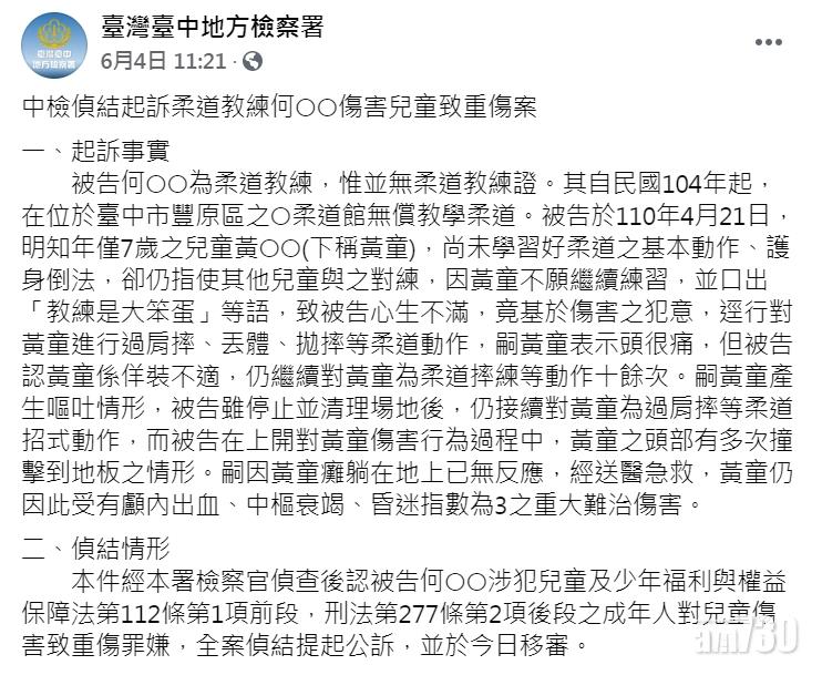 台中地方檢察署本月初,以涉事柔道教練觸犯刑法等法例與權益保障法等法例,向對方提出公訴,檢控人員指因應男童不治,會要求法院以傷害致死罪審理案件。