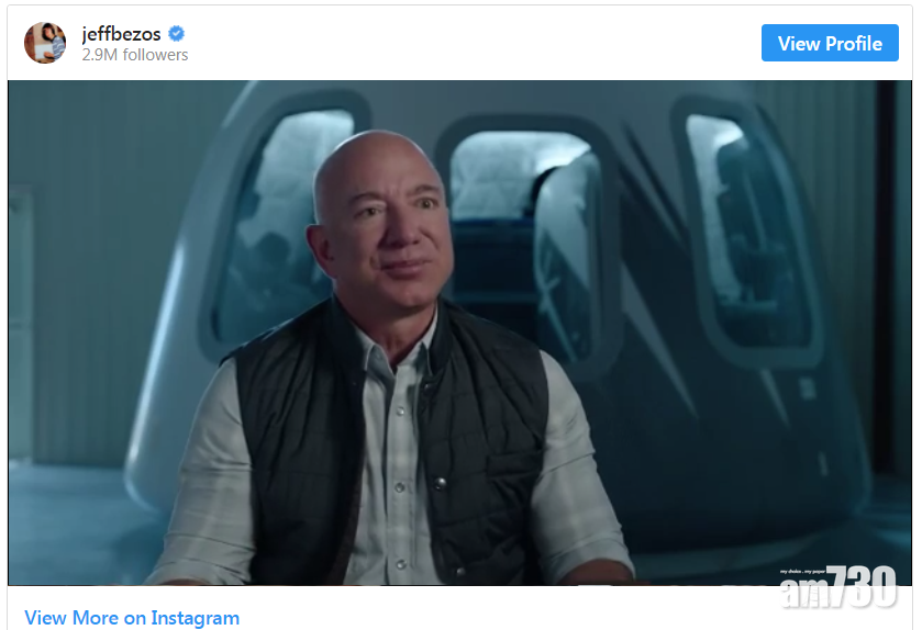貝索斯在IG發放的片段中稱,自5歲起已夢想到太空旅行,「在7月20日,我會與弟弟同行,與我最好的朋友一起大冒險」。英國富翁布蘭森的Virgin Galactic和Tesla行政總裁馬斯克的SpaceX,也正密鑼緊鼓推出太空旅行。