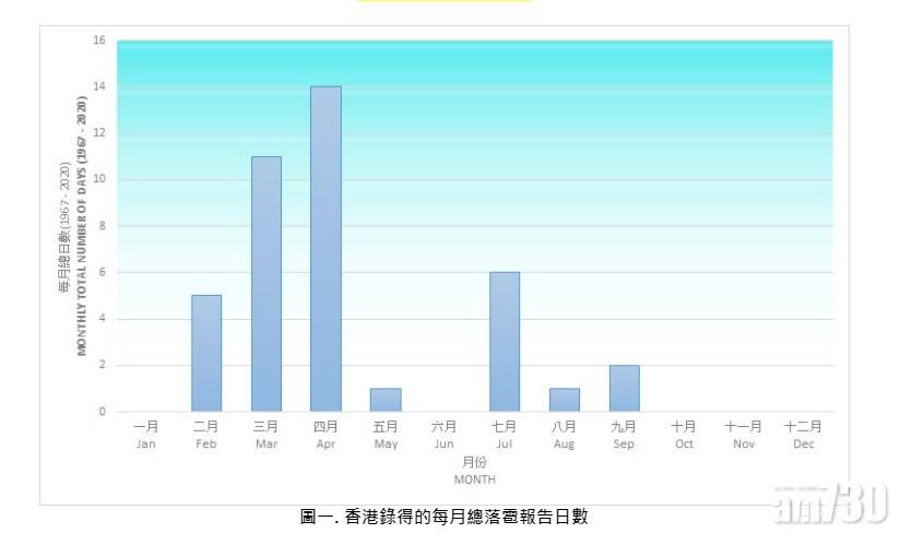 在1967年至2020年間,天文台錄得本港每月總落雹報告,當中以4月錄得最多日數。(天文台圖片)