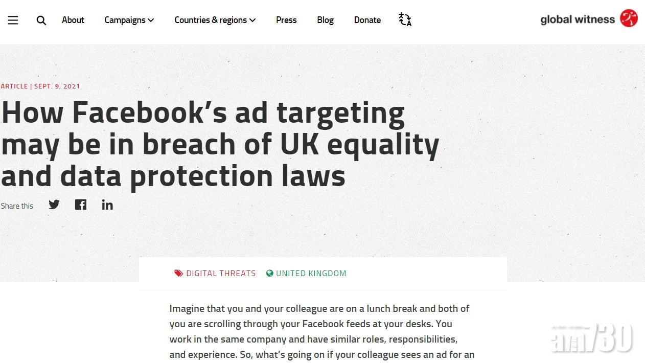 有非政府組織調查發現,社交平台Facebook的演算法會根據用戶的性別,推送不一樣的求職廣告,涉嫌違反英國的平等法。該非政府組織指,FB未能阻止針對特定目標歧視性的推送廣告,相關演算法在決定哪些人看到哪些廣告、看不到哪些廣告的時候帶有偏見。