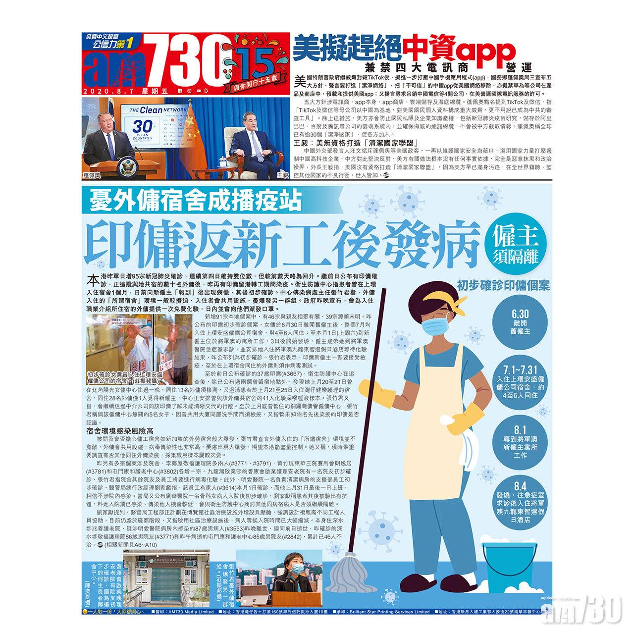 新增91宗本地個案中,有46宗與親友相聚有關、39宗源頭未明。昨公布的印傭初步確診個案,女傭於6月30日離開舊僱主後,整個7月均入住上環安盛僱傭公司宿舍,與4至6人同住;至本月1日(上周六)到新僱主位於將軍澳的寓所工作,3日後開始發燒,僱主遂帶她到將軍澳醫院急症室求診,並安排她入住將軍澳九龍東智選假日酒店等待化驗結果,昨公布列為初步確診。張竹君表示,印傭新僱主一家要接受檢疫,至於在上環宿舍同住的外傭則須作病毒測試。