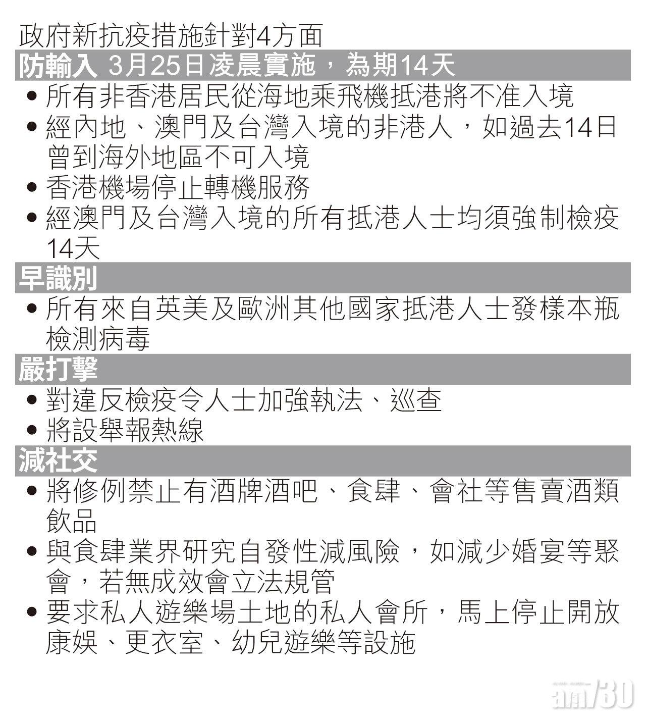本港新冠肺炎確診個案急增,社區大爆發風險大增,而醫療系統隨時爆煲。港府為切斷傳播鏈及減低社區傳播機會,繼上周要求中、台、澳以外抵港人士須強制檢疫後,昨再公布新「封關」措施,包括非港人由海外抵港後不可入境,同時擴大病毒檢測範圍;並將修例禁持酒牌場所售賣酒類飲品等,以冀「防輸入」、「減社交」,從外到內抗疫。