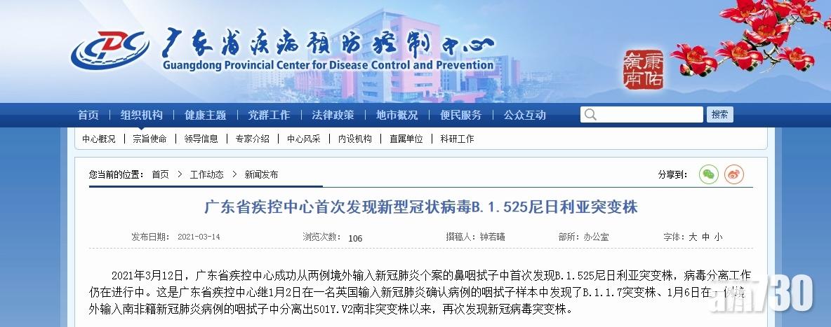 廣東省疾控中心公布,在兩名境外輸入新冠肺炎無症狀感染者的鼻咽拭子中,首次發現尼日利亞變種病毒株。