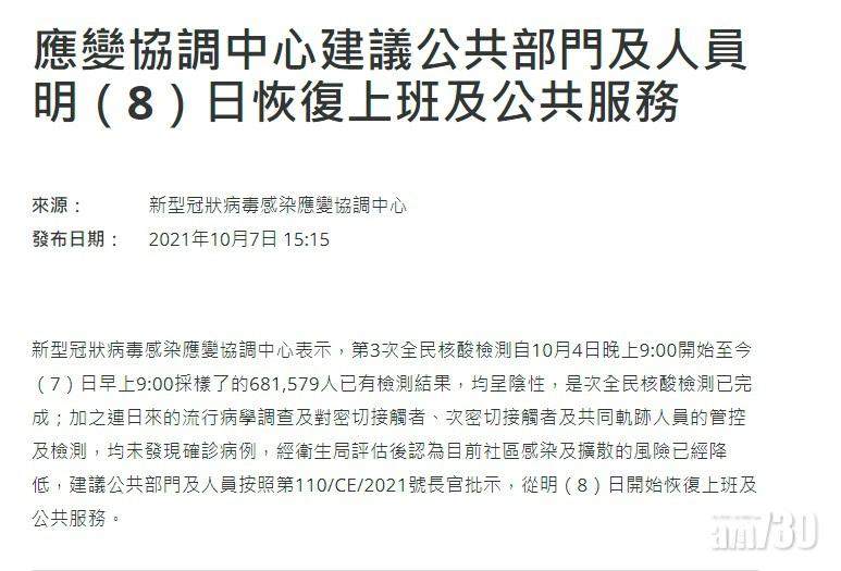 中心續指,加之連日來的流行病學調查及對密切接觸者、次密切接觸者及共同軌跡人員的管控及檢測,均未發現確診病例,經衛生局評估後認為目前社區感染及擴散的風險已經降低,建議公共部門及人員按照第110/CE/2021號長官批示,從明日開始恢復上班及公共服務。